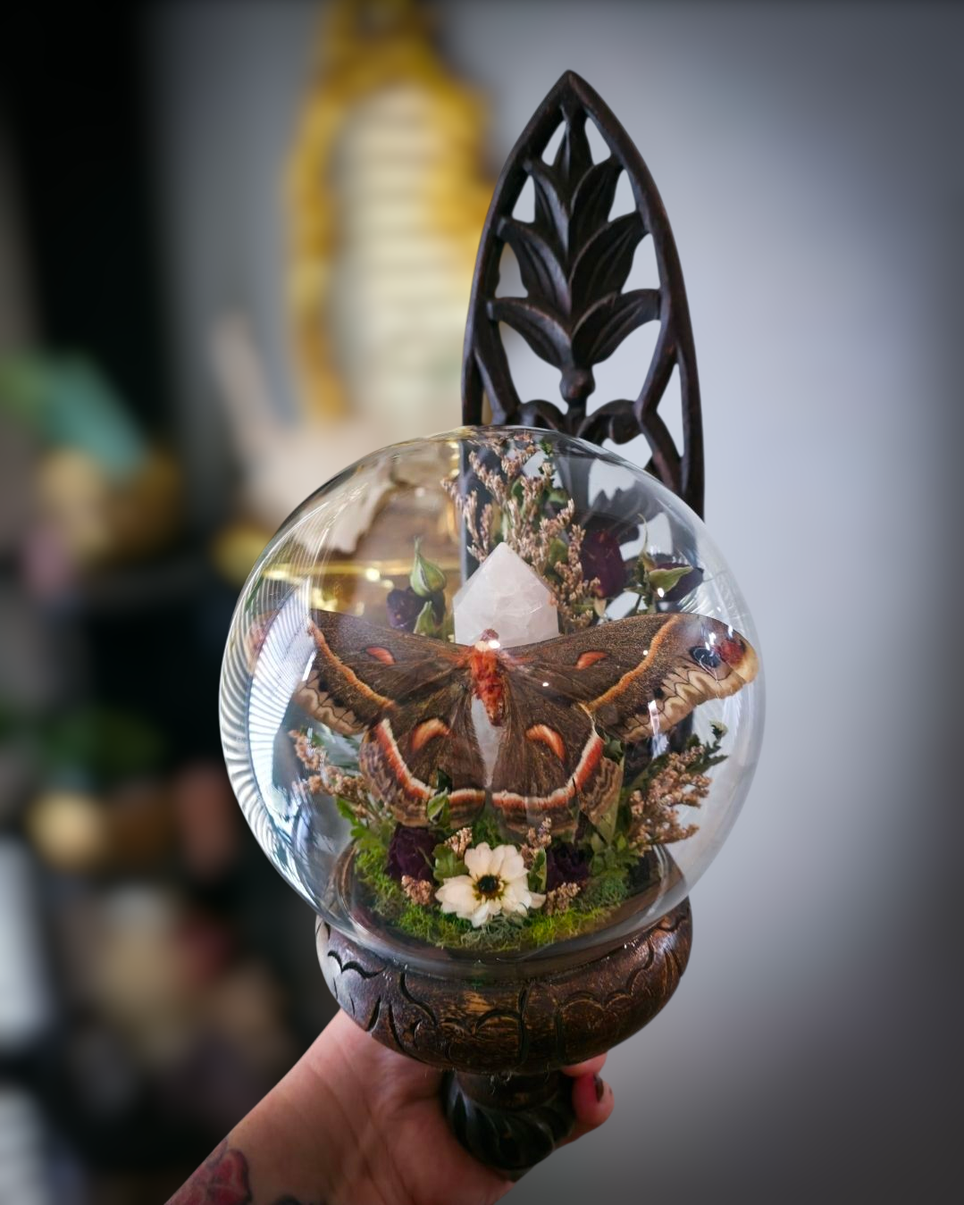 Tattered locally raised cecropia moth on agate tower surrounded by dried florals in a full size globe on a wooden sconce
