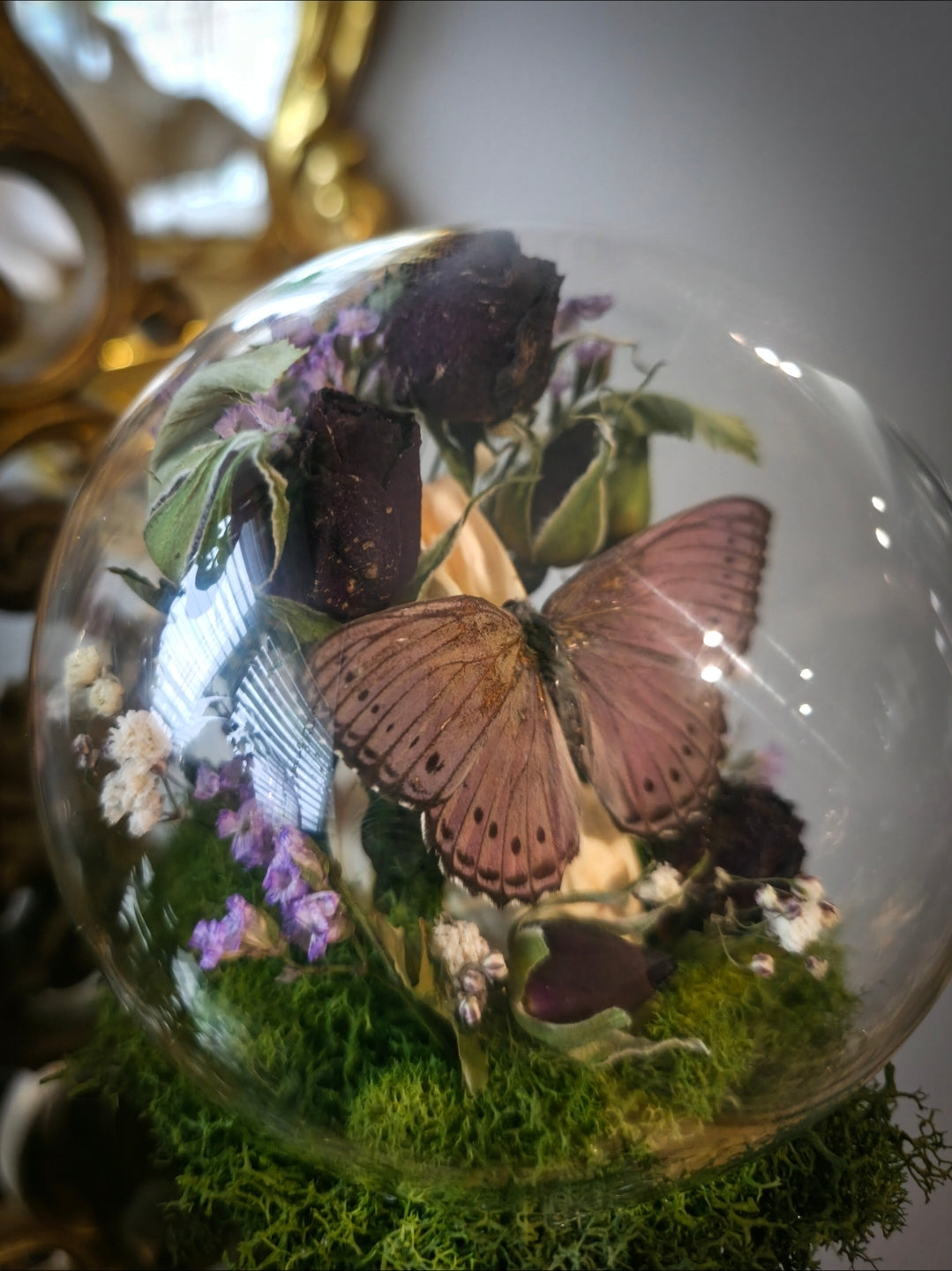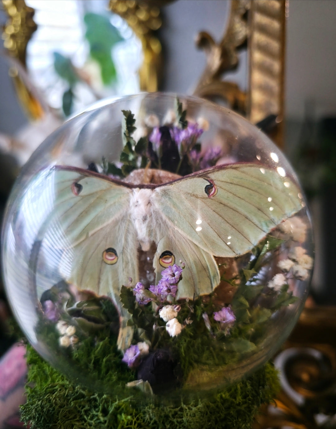 Vintage double mirrored sconce with two small globes one containing a tattered hand raised luna moth on pink amethyst druzy surrounded by dried florals and the other a spotted lilac tree nymph butterfly in a muskrat skull surrounded by dried florals