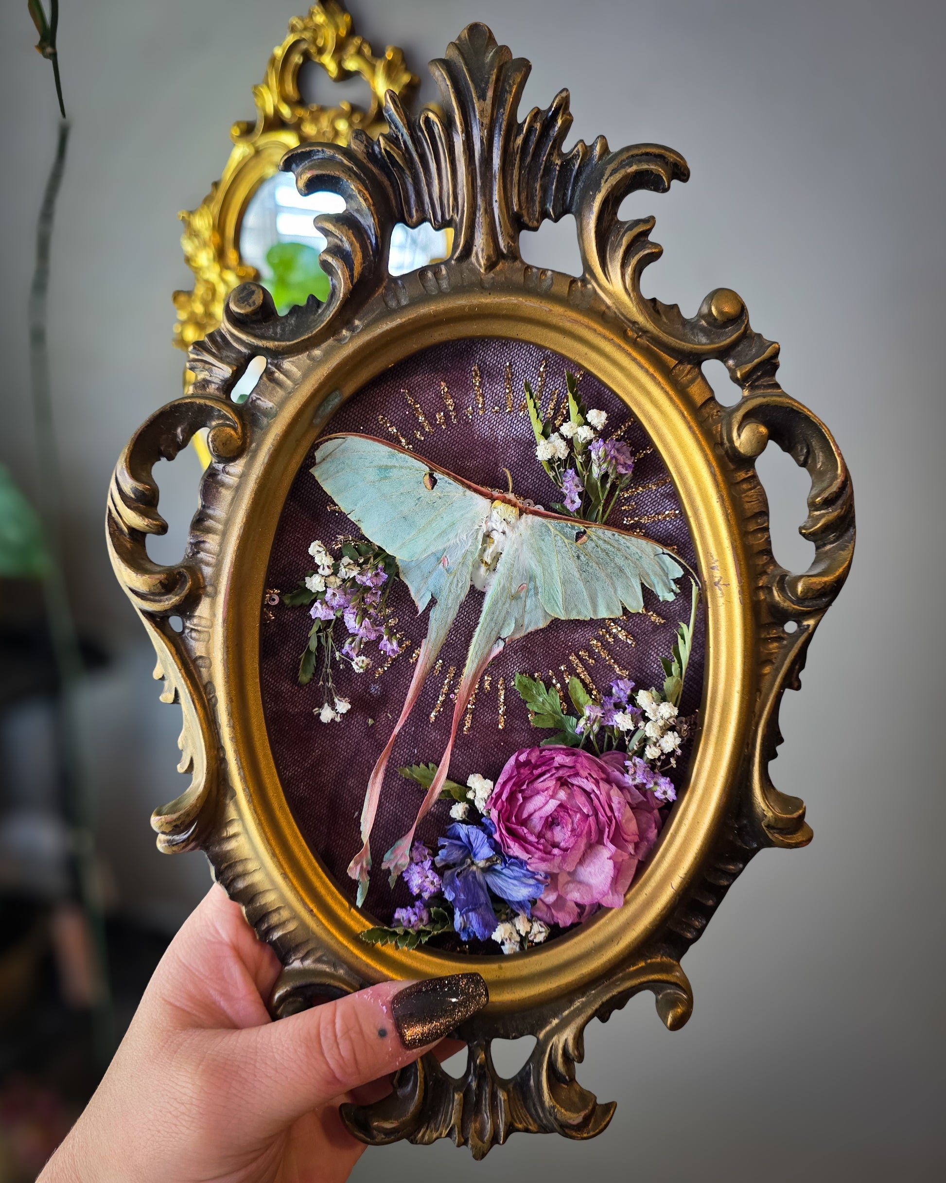 Tattered locally hand raised actias dubernardi Chinese moon moth on pink velvet with sequin aura overlay surrounded by dried florals in a vintage resin bubble glass frame