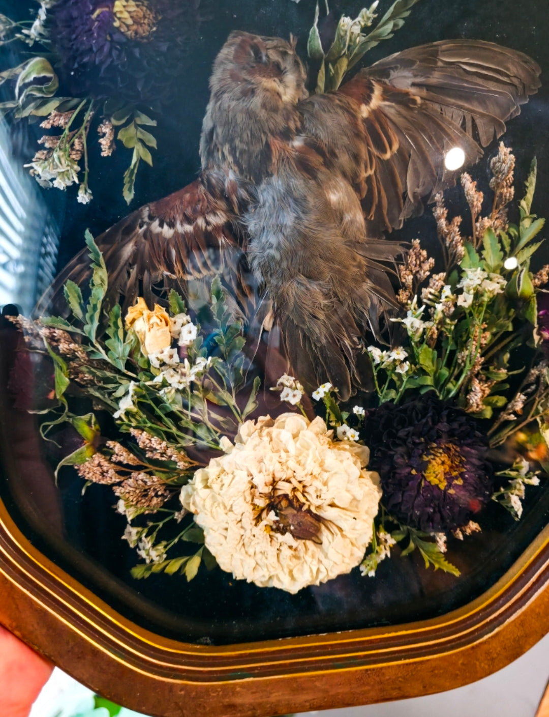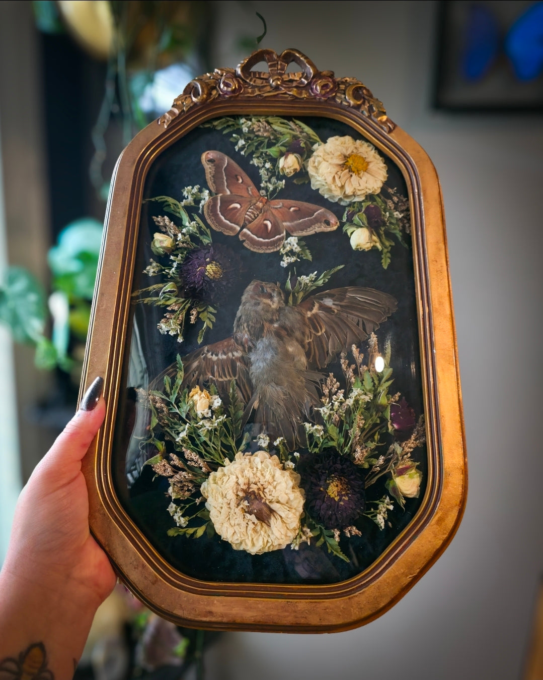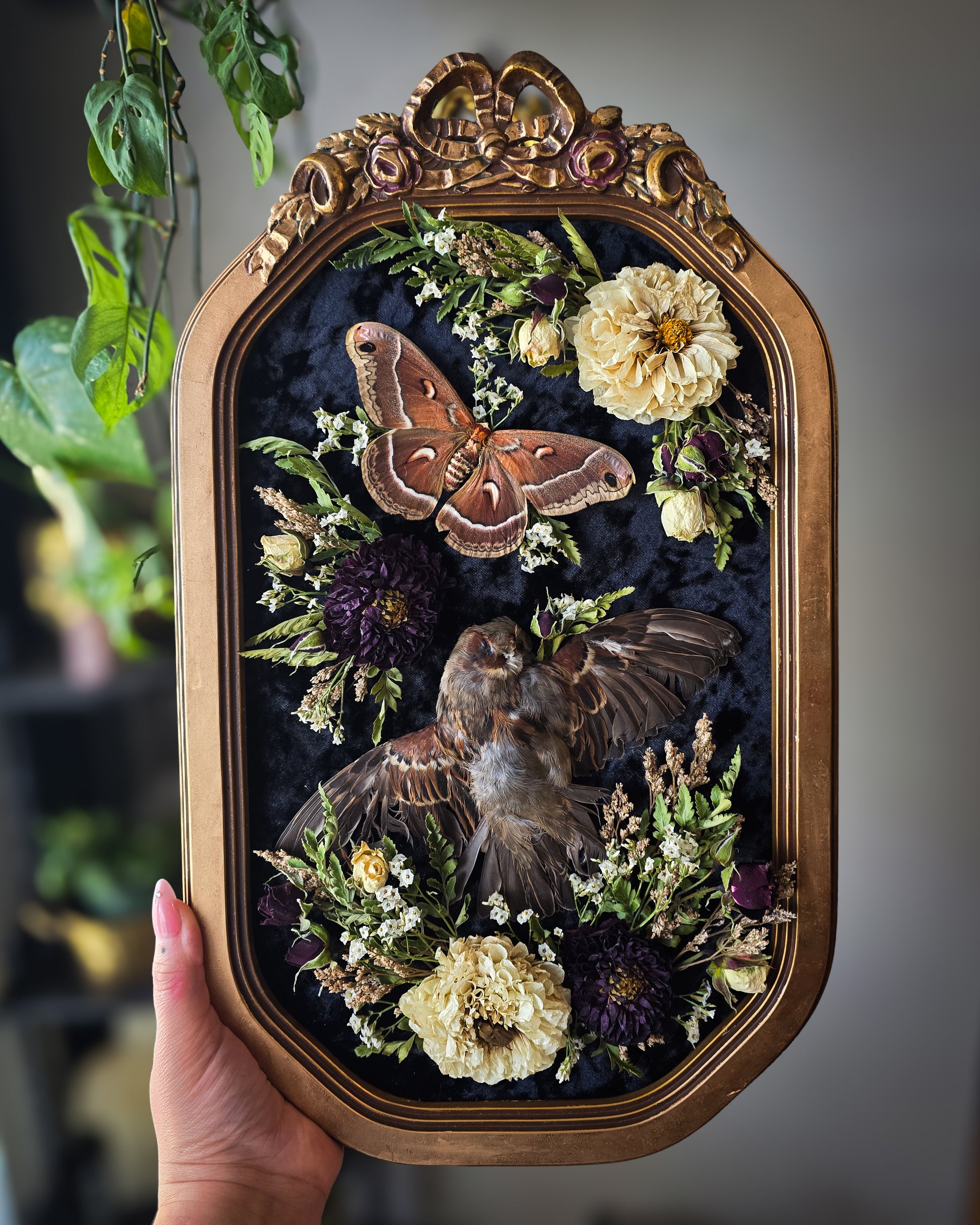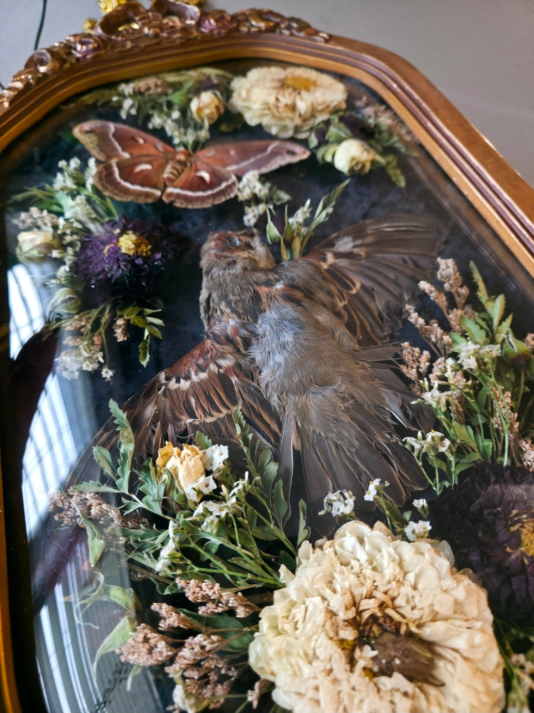 NOT mbta protected sparrow paired with a locally raised Glover's silkmoth dried florals and a tiny beetle friend on black velvet in a vintage bubble glass frame