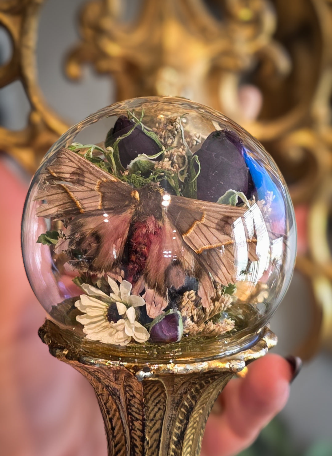 Tattered, beautiful and rare locally raised automeris frankae on smoky quartz point in a tiny globe surrounded by dried floeals atop a vintage brass sconce