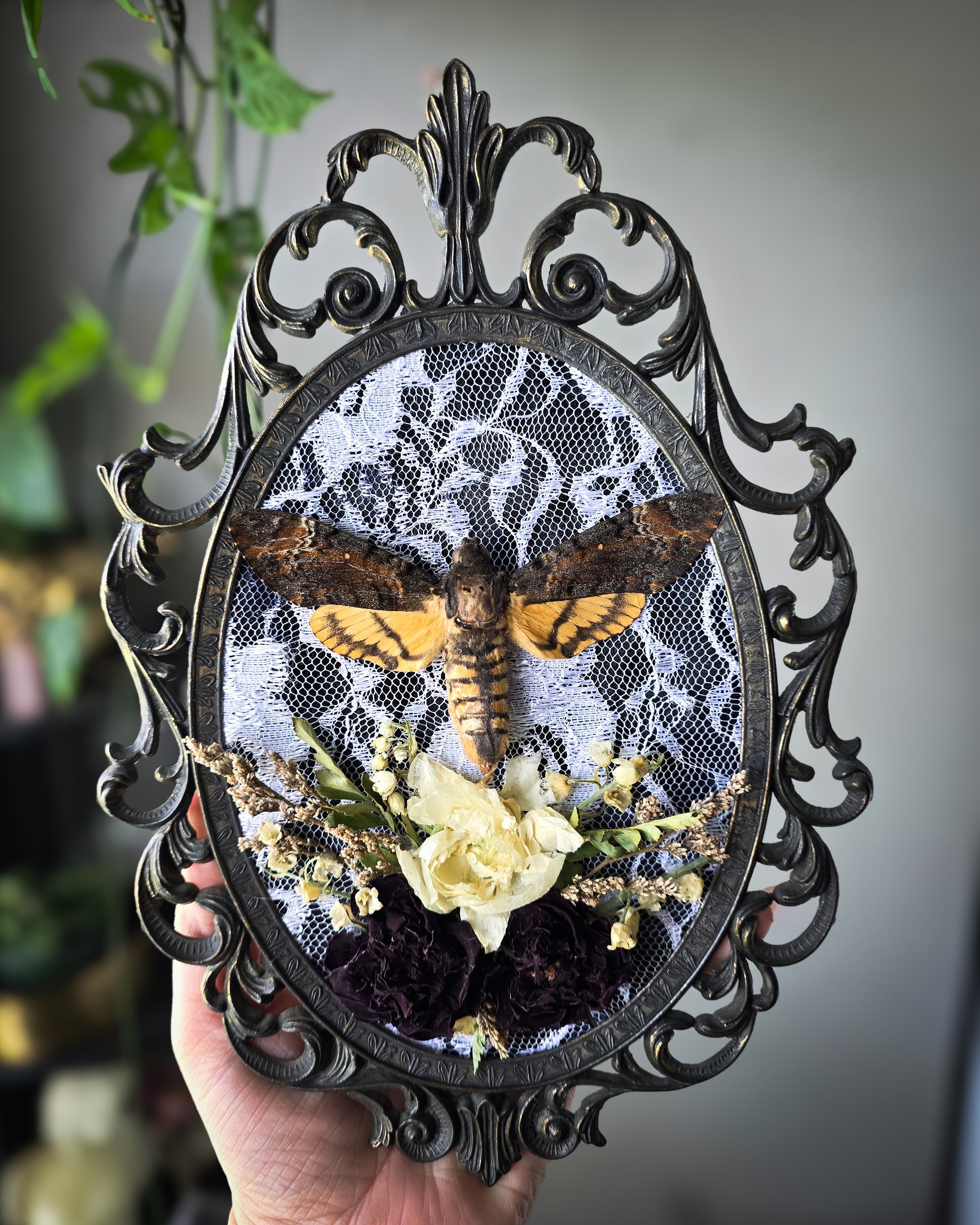 Deaths head moth on black velvet and white lace surrounded by dried flowers in vintage bubble glass frame glass included