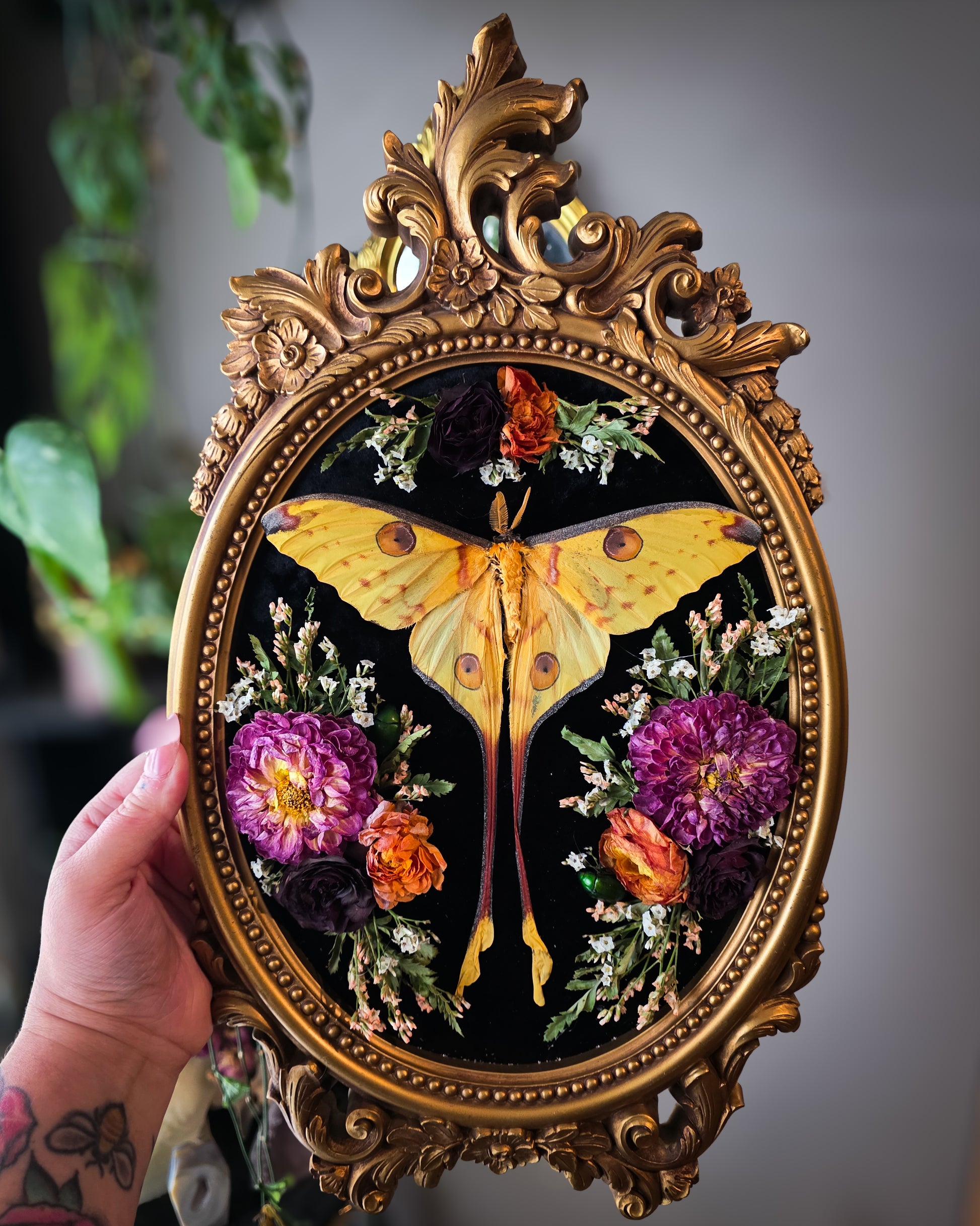 Comet moth on black velvet surrounded by dried sunset colored floral arrangements with two small green flower beetles in gorgeous vintage bubble glass frame