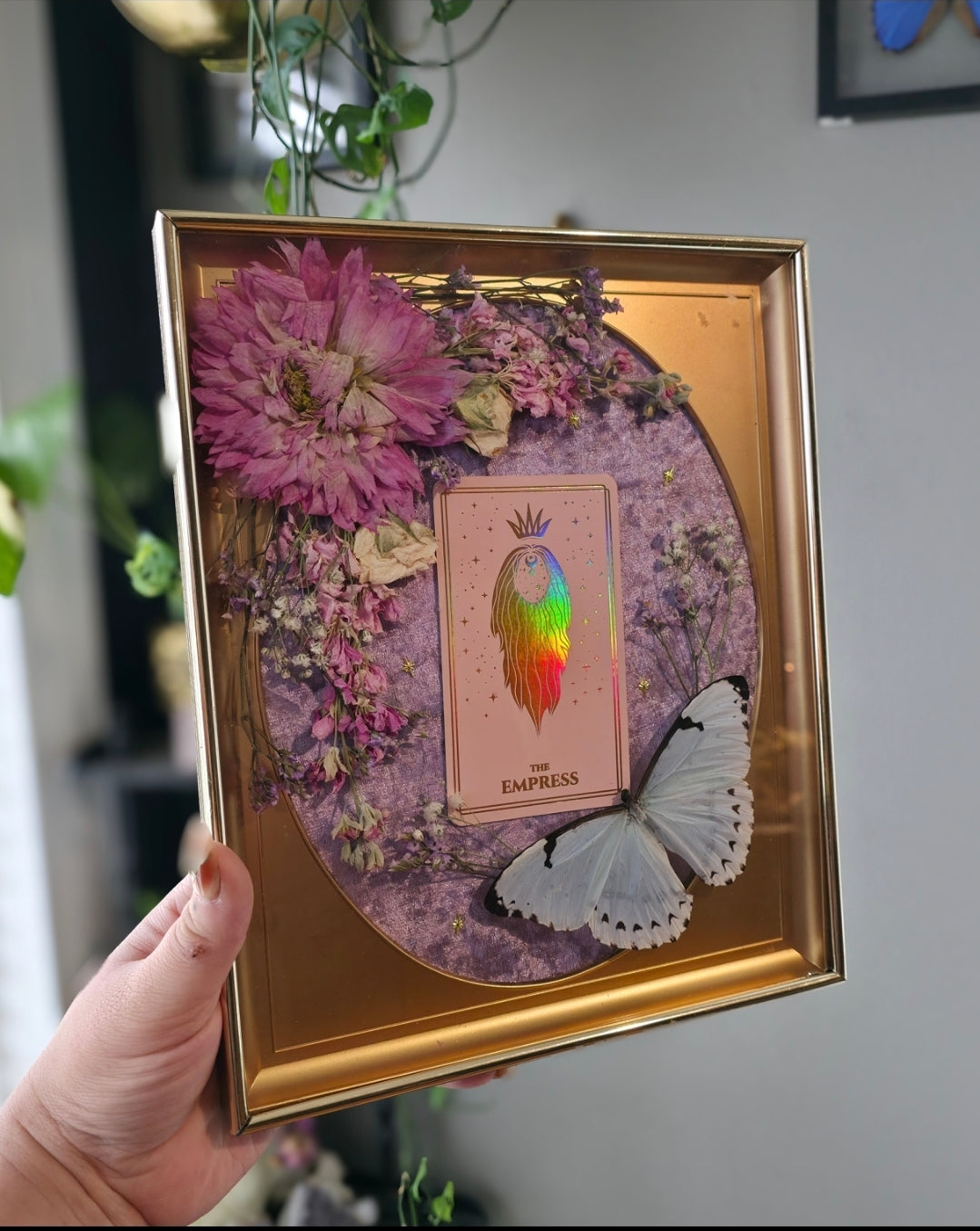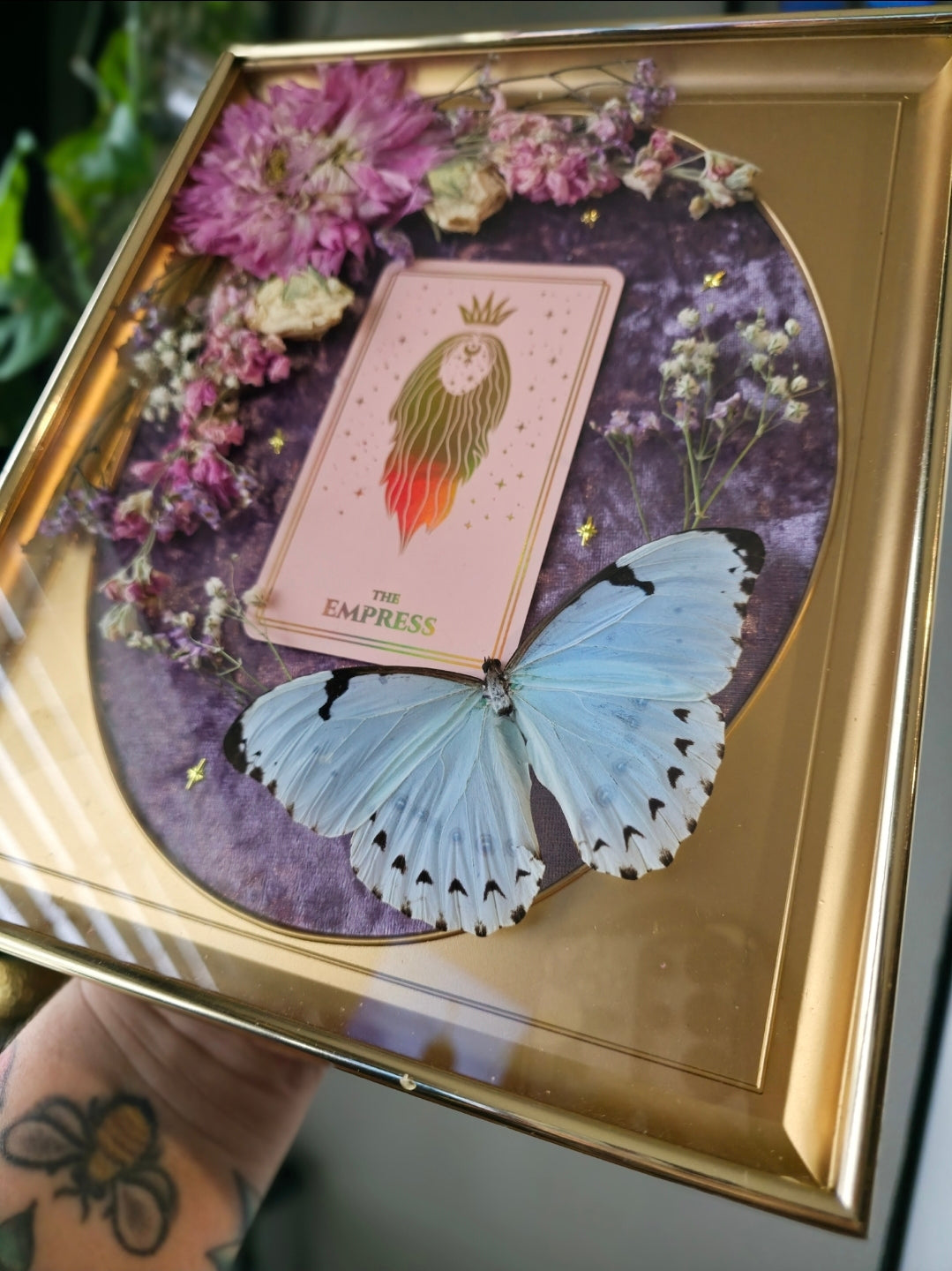 The empress card on lilac velvet, morpho catenarius surrounded by dried florals with star embellishments in vintage mcm frame
